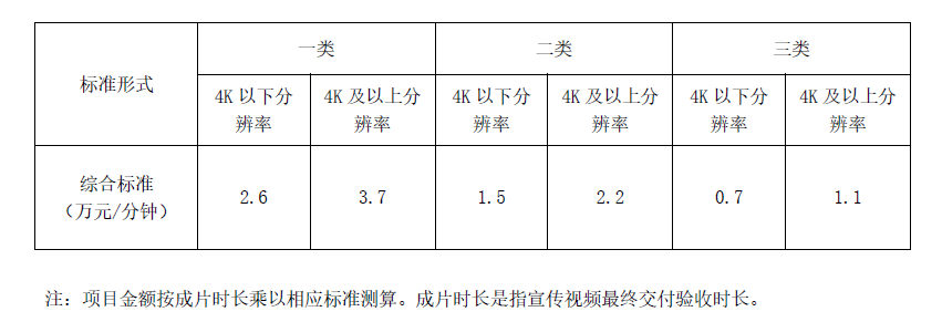 宣传视频制作费预算支出总额按如下综合标准控制:
